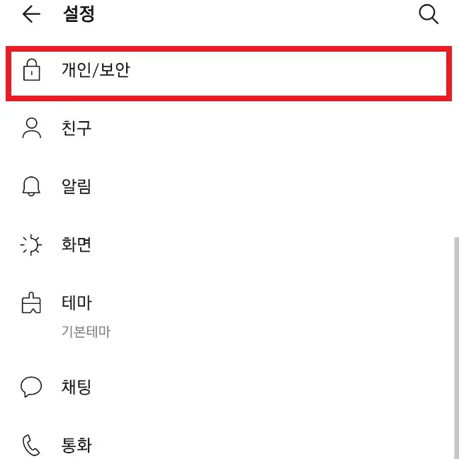 카카오톡에서 우측 하단에 점세개를 들어가서 우측상단에 보이는 톱니바퀴를 선택해줍니다. 설정 화면으로 넘어오게 되는데, 설정 화면에서 개인/보안을 선택합니다.